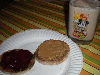 Anyways, enough about that – this is a food blog right? Sunday was a rest day after an AMAZING run on Saturday. I think it had something to do with my Thai food pig-out on Friday night. So no regrets. I did a short run today and then breakfast which was a smoothie with almond milk, frozen naner, 1/2 scoop protein powder and ice. I also had an English Muffin with PB&J (and a couple bites of eggs that I made for Matt opps!).